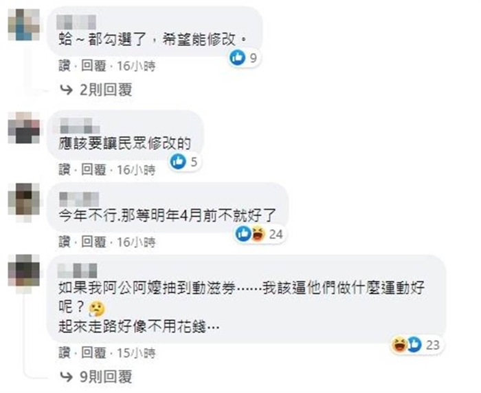 消息一出引發(fā)大批網(wǎng)友崩潰,紛紛在相關(guān)新聞鏈接下留言:“不能買運(yùn)動(dòng)用品……太扯啦!”“蛤!都勾選了,希望能修改”、“上次還能買電競用品,這次只能看比賽,有夠爛”、“所以是鼓勵(lì)群聚看比賽?”“亂搞一通……拿券一起去看球賽,然后染疫嗎?”但也有網(wǎng)友表示:“反正政策都會(huì)轉(zhuǎn)彎”、“蔡當(dāng)局最愛校正回歸、滾動(dòng)式修正了,罵一罵說不定就改了”、“放心會(huì)有解套的”、“今年不行,那等明年4月前不就好了”。