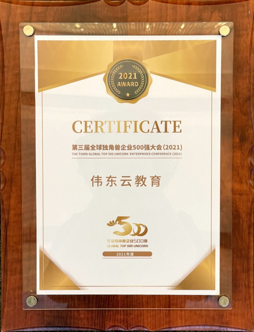 圖:偉東云教育“2021全球獨角獸企業(yè)500強(qiáng)”證書