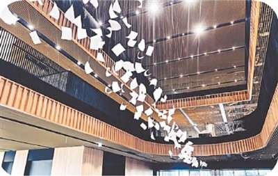 走進(jìn)大廳,英國藝術(shù)家保羅·考克斯基在挑高大廳創(chuàng)作的公共藝術(shù)作品“陣風(fēng)”映入眼簾。上千本白紙書頁隨風(fēng)騰飛的瞬間在空中凝結(jié)下來,象征著閱讀的快樂與思考,震撼的畫面宛如置身充滿藝術(shù)氣息的美術(shù)館。