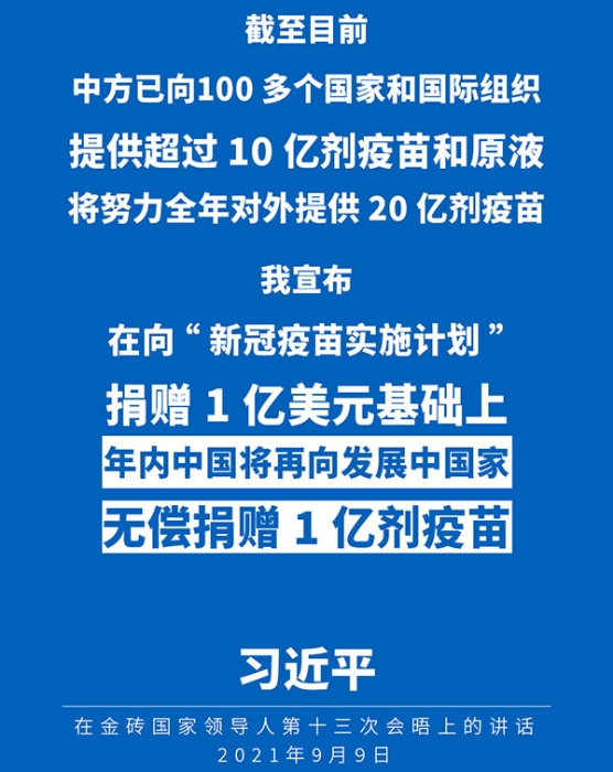 第二,堅(jiān)持公平可及,加強(qiáng)疫苗國(guó)際合作。中方向有需要的國(guó)家提供疫苗和相應(yīng)技術(shù)支持,為促進(jìn)疫苗公平分配、加強(qiáng)全球抗疫合作作出積極貢獻(xiàn)。截至目前,中方已向100多個(gè)國(guó)家和國(guó)際組織提供超過(guò)10億劑疫苗和原液,將努力全年對(duì)外提供20億劑疫苗。我愿宣布,在向“新冠疫苗實(shí)施計(jì)劃”捐贈(zèng)1億美元基礎(chǔ)上,年內(nèi)中國(guó)將再向發(fā)展中國(guó)家無(wú)償捐贈(zèng)1億劑疫苗。