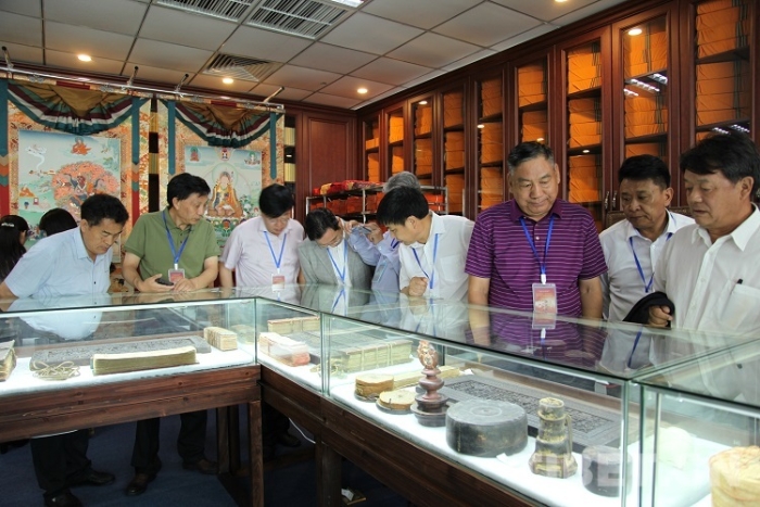 圖為與會(huì)的諸位嘉賓在喜馬拉雅文庫(kù)考察、觀摩了藏醫(yī)藥古籍文獻(xiàn)