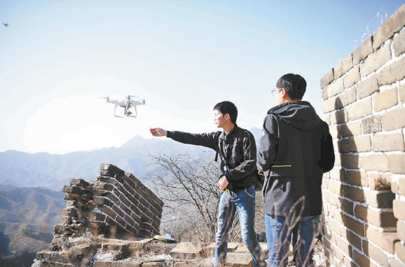 工程探測(cè)人員在長(zhǎng)城上探測(cè)、記錄相關(guān)數(shù)據(jù),為明年的搶修計(jì)劃做準(zhǔn)備。記者 和冠欣攝