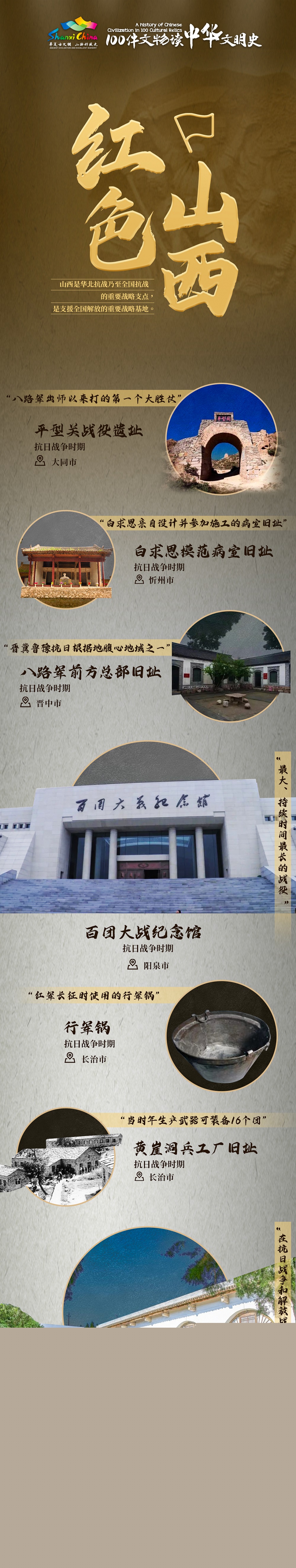 如何打卡這些紅色革命文物呢?我們精心安排好了打卡路線。首先去山西省大同市的「平型關(guān)戰(zhàn)役遺址」打卡;接下來(lái)到忻州市「白求恩模范病室舊址」打卡;之后到與忻州市接壤的呂梁市陽(yáng)泉市分別打卡「晉綏邊區(qū)政府及軍區(qū)司令部舊址(晉綏邊區(qū)革命紀(jì)念館)」和「百團(tuán)大戰(zhàn)紀(jì)念館(碑)」;最后來(lái)晉中市打卡「八路軍前方總部舊址」和去長(zhǎng)治市打卡「黃崖洞兵工廠舊址」「行軍鍋」?!凹t色山西”的這些紅色革命文物,是抗日戰(zhàn)爭(zhēng)時(shí)期人們?yōu)閷?shí)現(xiàn)民族獨(dú)立和人民解放時(shí)所留下來(lái)的,它們的存在是要讓我們將“勿忘國(guó)恥,振興中華!”的警語(yǔ)時(shí)刻牢記心中!