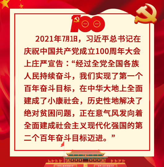 2021年7月1日,習(xí)近平總書(shū)記在慶祝中國(guó)共產(chǎn)黨成立100周年大會(huì)上莊嚴(yán)宣告,經(jīng)過(guò)全黨全國(guó)各族人民持續(xù)奮斗,我們實(shí)現(xiàn)了第一個(gè)百年奮斗目標(biāo),在中華大地上全面建成了小康社會(huì)。