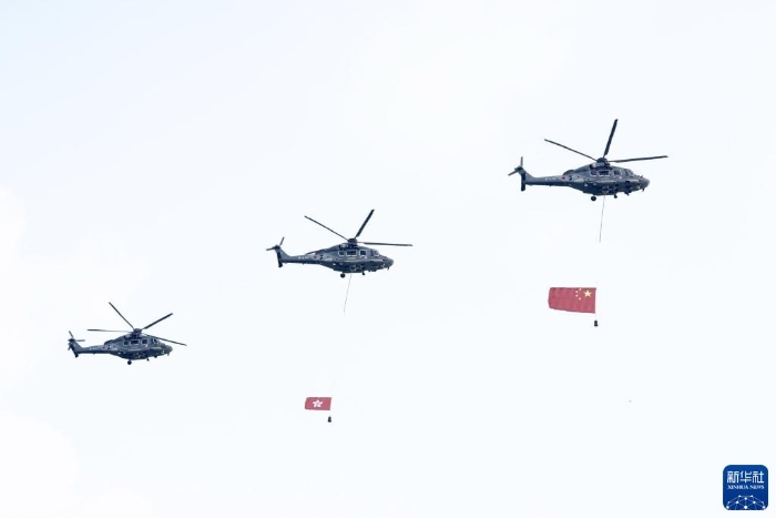 10月1日,香港特區(qū)政府在金紫荊廣場(chǎng)舉行升旗儀式。這是特區(qū)政府飛行服務(wù)隊(duì)直升機(jī)懸掛著國旗和區(qū)旗飛過維港上空。