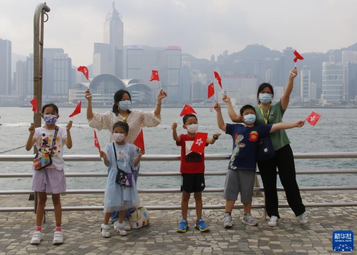 10月1日,香港市民在尖沙咀揮動(dòng)國旗和香港特區(qū)區(qū)旗。