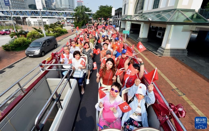 10月1日,在香港街頭,參加慶祝國慶巴士巡游的人們揮動(dòng)國旗和香港特區(qū)區(qū)旗。