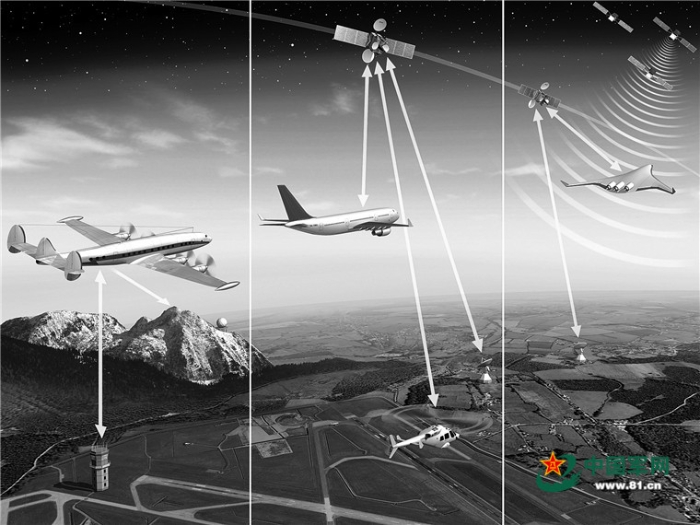 上圖:地面導(dǎo)航臺和人造衛(wèi)星為飛機指引航向示意圖。資料照片