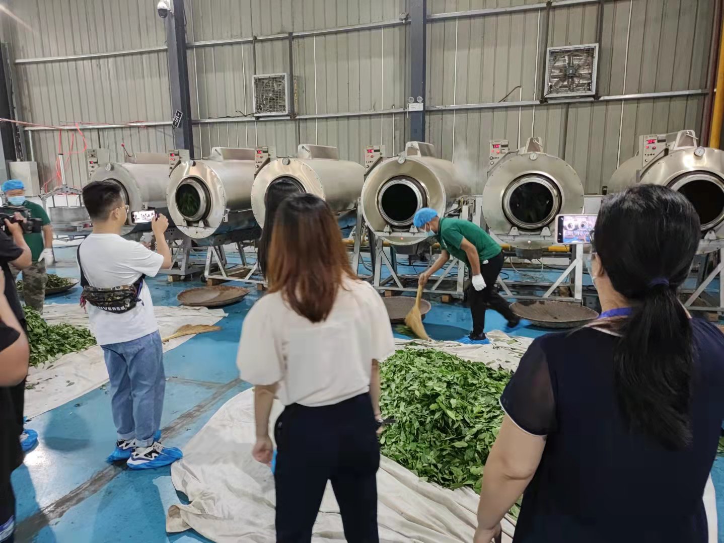 兩岸記者實地探訪了盛德來茶葉發(fā)展有限公司廠區(qū),一路觀看采摘之后的茶葉,經(jīng)歷從日光萎凋、搖青、炒茶,到揉茶、干燥、除梗的復(fù)雜工序,從而生產(chǎn)出將臺式烏龍茶制茶技術(shù)和信陽茶葉進行有機結(jié)合的“信陽式”烏龍茶。