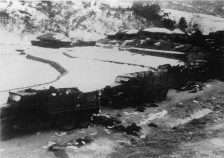 一群一群的美國(guó)兵死在車上或車下,其余的都狼狽地拋掉卡車和榴彈炮逃命。但是他們逃不出中國(guó)人民志愿軍給他們布置下的天羅地網(wǎng)。
