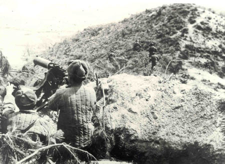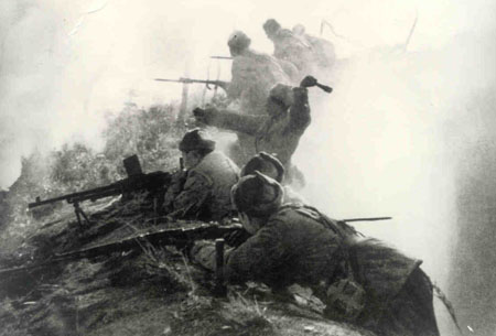 △在機槍的掩護下,志愿軍戰(zhàn)士向橫城之敵發(fā)起沖擊。圖源:中國軍網(wǎng)