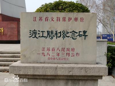 渡江勝利紀念碑--—位于江蘇省南京市鼓樓區(qū)熱河路廣場中心,建于1979年4月。遠遠望去,整座紀念碑如同一艘乘風破浪的戰(zhàn)艦。碑座正面鐫刻鄧小平手書“渡江勝利紀念碑”,背面鐫刻毛澤東手跡《七律·人民解放軍占領南京》。