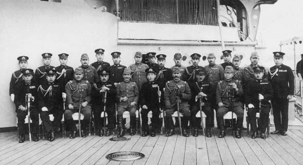 上海派遣軍司令官松井石根(前排左五)與日軍其他將領(lǐng)在軍艦上合影。曾任日軍華中方面軍司令,組織發(fā)動(dòng)了南京大屠殺。