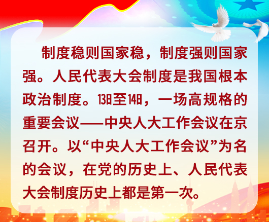 中央人大工作會議10月13日至14日在北京召開。中共中央總書記、國家主席、中央軍委主席習近平出席會議并發(fā)表重要講話,強調人民代表大會制度是符合我國國情和實際、體現社會主義國家性質、保證人民當家作主、保障實現中華民族偉大復興的好制度,是我們黨領導人民在人類政治制度史上的偉大創(chuàng)造,是在我國政治發(fā)展史乃至世界政治發(fā)展史上具有重大意義的全新政治制度。我們要堅持中國特色社會主義政治發(fā)展道路,堅持和完善人民代表大會制度,加強和改進新時代人大工作,不斷發(fā)展全過程人民民主,鞏固和發(fā)展生動活潑、安定團結的政治局面。