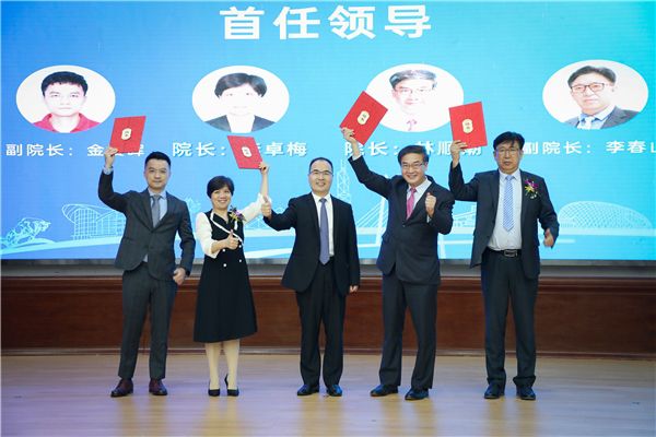 許建領(lǐng)校長為深職院·?,斞垡暪鈱W院首任院長林順潮教授和李卓梅女士,副院長李春山先生和金晨暉先生頒發(fā)聘書。