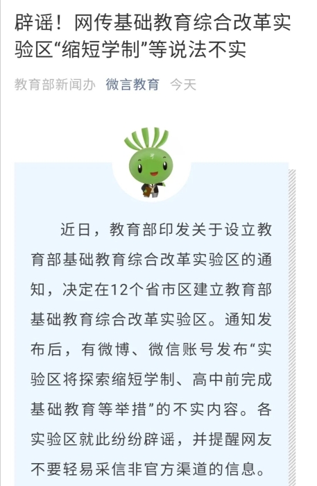 針對(duì)沸沸揚(yáng)揚(yáng)的“大尺度”學(xué)制改革傳言,各基礎(chǔ)教育綜合改革實(shí)驗(yàn)區(qū)均予以辟謠。10月18日,教育部官微“微言教育”也轉(zhuǎn)發(fā)了相關(guān)內(nèi)容,稱“實(shí)驗(yàn)區(qū)將探索縮短學(xué)制、高中前完成基礎(chǔ)教育等舉措”內(nèi)容不實(shí),并提醒網(wǎng)友不要輕易采信非官方渠道的信息。
