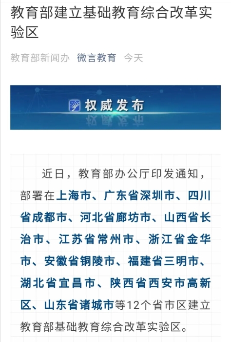 ▲10月18日,教育部官微“微言教育”同時(shí)發(fā)布了“教育部建立基礎(chǔ)教育綜合改革實(shí)驗(yàn)區(qū)”的消息,但改革內(nèi)容并不涉及學(xué)制變動(dòng)。圖/“微言教育”公號(hào)截圖