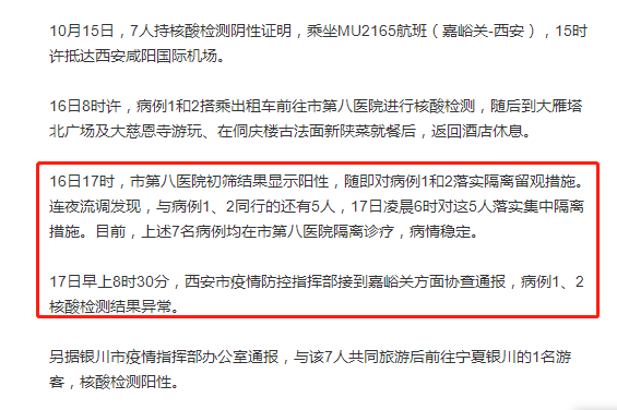 另外,根據(jù)西安通報,17日早上8時30分,西安市疫情防控指揮部接到嘉峪關(guān)方面協(xié)查通報,病例1、2核酸檢測結(jié)果異常。而16日17時,西安市第八醫(yī)院核酸檢測初篩陽性結(jié)果已出,隨即對病例1和2落實隔離留觀措施。