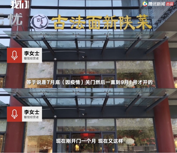 ▲該餐館經(jīng)營(yíng)者表示,自己的門店曾于7月底因?yàn)橐咔殛P(guān)門停業(yè)。圖/新京報(bào)我們視頻截圖