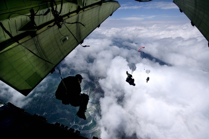 15名空降兵從地震災(zāi)區(qū)四川茂縣上空4999米的高空奮不顧身跳下,進(jìn)入道路阻斷的災(zāi)區(qū)參加救援(2008年5月14日攝)。新華社發(fā)(劉應(yīng)華 攝)