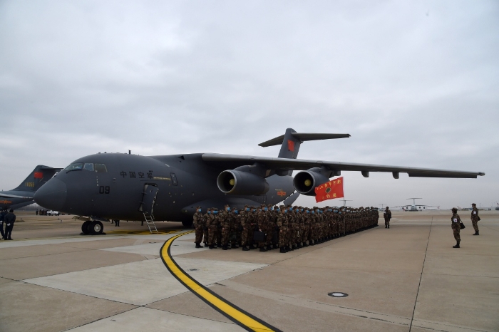 一批增援武漢的軍隊(duì)醫(yī)護(hù)人員乘坐國(guó)產(chǎn)運(yùn)-20運(yùn)輸機(jī)抵達(dá)武漢天河機(jī)場(chǎng)(2020年2月13日攝)。新華社記者 黎云 攝