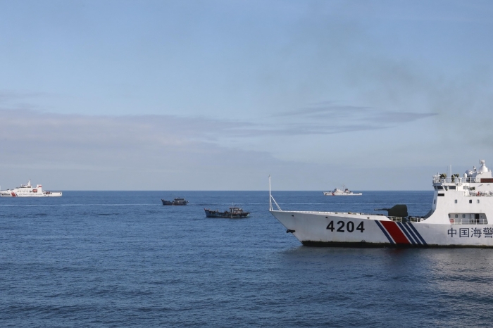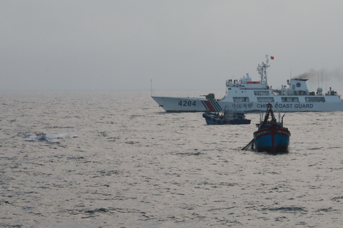 中國(guó)海警4204艦對(duì)在北部灣海域位我方一側(cè)海域非法捕撈的越南漁船進(jìn)行驅(qū)離(10月19日攝)。新華社發(fā)(鄭建清 攝)