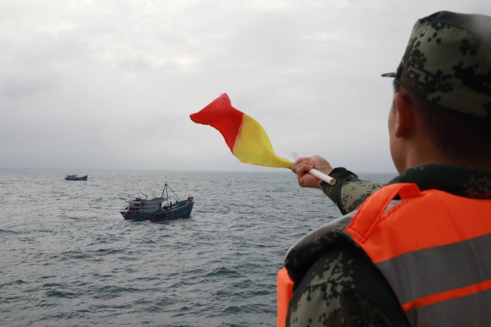 中國(guó)海警執(zhí)法員運(yùn)用旗語(yǔ)對(duì)在北部灣海域非法捕撈的越南漁船進(jìn)行驅(qū)離(10月19日攝)。新華社發(fā)(鄭建清 攝)