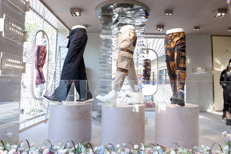 在鏡面、金屬、光影營造的機(jī)械科技感中,繽紛多彩、款式多樣的九牧王男褲是壓場的存在。店內(nèi)最為吸睛的一幕,莫過于店中心頂部,環(huán)繞排列著邁步姿勢的各式男褲,傳遞九牧王每7秒便賣出一條③的熱銷成績。店內(nèi)還有運(yùn)用針線、面料等元素的創(chuàng)意造景,詮釋九牧王匠心工藝與行業(yè)實(shí)力,非常值得前來實(shí)地體驗(yàn)、探索解讀。