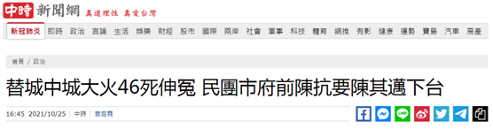 島內(nèi)民眾今天到高雄市政府前抗議,要求市長陳其邁為“城中城”大火負責下臺。圖自臺灣“中時新聞網(wǎng)”