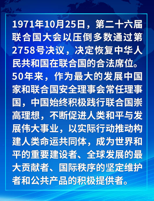 習(xí)近平強(qiáng)調(diào),新中國(guó)恢復(fù)在聯(lián)合國(guó)合法席位以來(lái)的50年,是中國(guó)和平發(fā)展、造福人類(lèi)的50年。