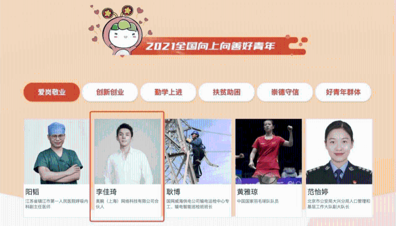 “全國向上向善好青年”推選活動由共青團(tuán)中央舉辦,每年舉辦一次,采取社會化推選的方式,廣泛動員各領(lǐng)域、各行業(yè)團(tuán)員青年積極參與活動,當(dāng)選人員來自全國各個地區(qū),涵蓋青年社會組織成員、新興領(lǐng)域青年、青年職工、農(nóng)村青年致富帶頭人、青年創(chuàng)業(yè)者、青年科技工作者、青年學(xué)生、青年教師、青年醫(yī)生、青年官兵、青年公安民警、青年志愿者等職業(yè)和領(lǐng)域,具有廣泛的代表性。