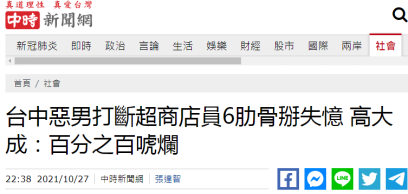 【環(huán)球網(wǎng)報道 記者 尹艷輝】據(jù)臺灣“中時新聞網(wǎng)”27日報道,臺中22歲周姓男子23日凌晨2點多進入一家超市,店員提醒他戴上口罩,不料男子拿玻璃瓶瘋狂毆打,將店員打到眼眶碎裂、肋骨骨折,血胸合并腦震蕩,周姓男子被捕后卻辯稱當時發(fā)酒瘋失憶,不記得打人。對此,法醫(yī)高大成表示,周姓男子才20歲出頭,喝酒喝到失憶這種說法,“百分之百唬爛(形容人說假話)”。