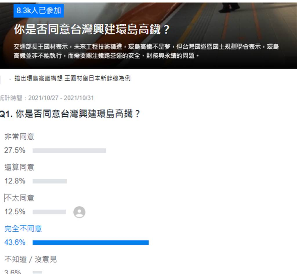 對于臺灣是否該興建環(huán)島高鐵,入口網(wǎng)站《Yahoo奇摩》27日就對此發(fā)起網(wǎng)絡(luò)投票民調(diào),以“你是否同意臺灣興建環(huán)島高鐵?”為題詢問廣大網(wǎng)友看法,投票時(shí)間為10月27日至31日,截至27日晚間11時(shí)30分為止,共有8300多名網(wǎng)友投票,列出5個(gè)選項(xiàng),表示“非常同意”,比例占27.5%;“還算同意”占12.8%,共有40.8%的網(wǎng)友傾向“需要”?!安惶狻闭?2.5%、“非常不同意”占43.6%,有56.1%的網(wǎng)友傾向“不同意”,另“不知道/沒意見”占3.6%。