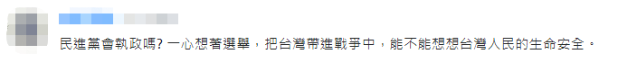 有網(wǎng)友無(wú)奈,“禍福無(wú)門(mén)惟人自招,臺(tái)灣要被害死了?!薄懊襁M(jìn)黨會(huì)執(zhí)政嗎?一心想著選舉,把臺(tái)灣帶進(jìn)戰(zhàn)爭(zhēng)中,能不能想想臺(tái)灣人民的生命安全?!?/p>