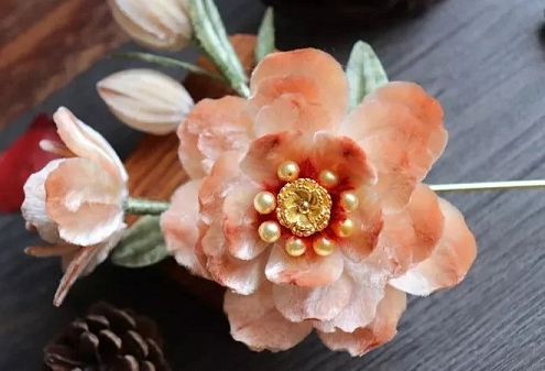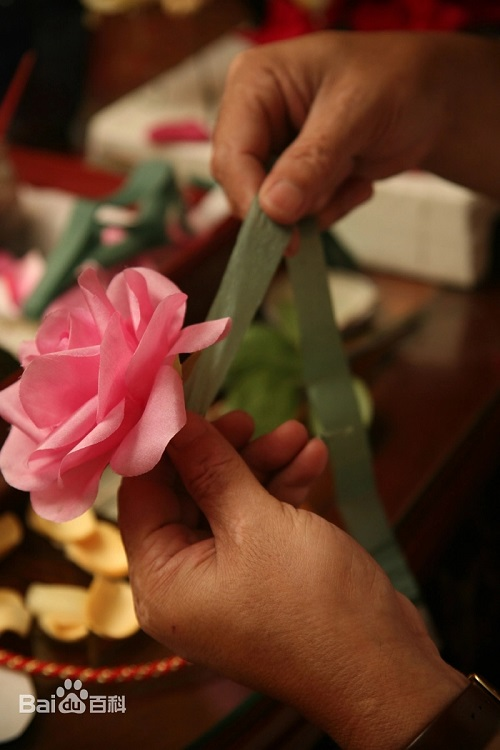 絹花的制作過(guò)程分為選料、上漿、染色、窩瓣、烘干、定型、粘花和組枝等工序。