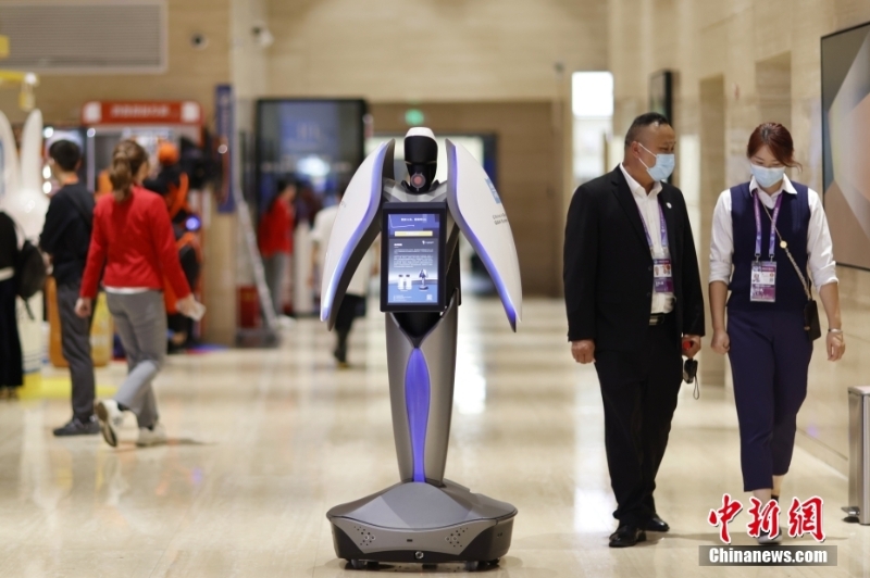 11月4日,上海,第四屆中國國際進(jìn)口博覽會新聞中心,智能機(jī)器人“時(shí)刻準(zhǔn)備”提供服務(wù)。 中新社記者 盛佳鵬 攝
