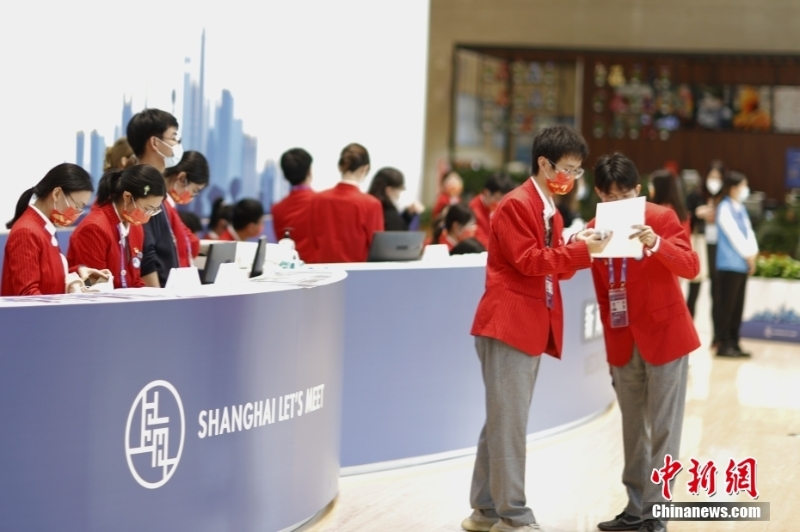 11月4日,上海,第四屆中國國際進(jìn)口博覽會新聞中心正式開放運(yùn)營,工作人員為媒體工作者答疑解問。 中新社記者 蔣啟明 攝