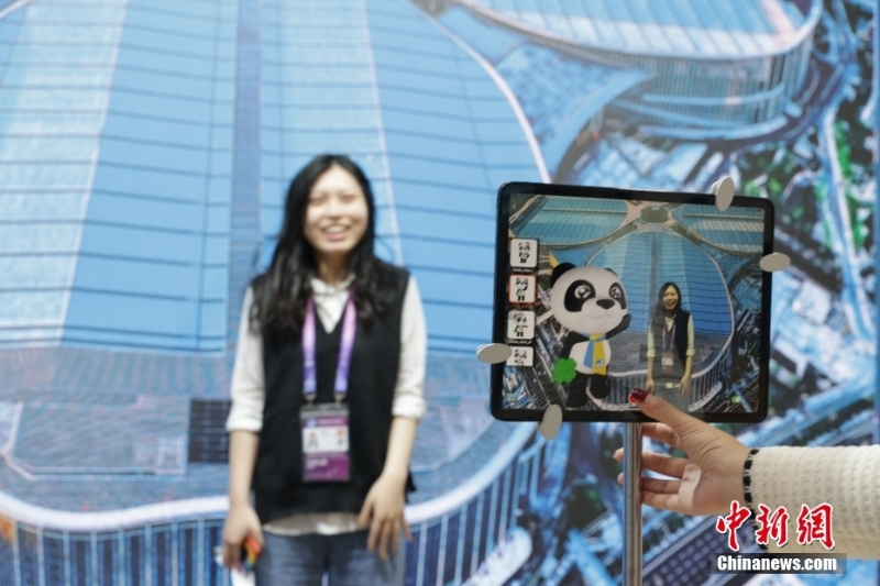 11月4日,上海,第四屆中國國際進(jìn)口博覽會新聞中心正式開放運(yùn)營。在新聞中心的AI合影區(qū),AI虛擬吉祥物“進(jìn)寶”與參會人員合影。 中新社記者 楊可佳 攝