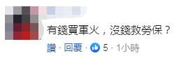 對(duì)于民進(jìn)黨當(dāng)局砸巨資購(gòu)買(mǎi)武器,有島內(nèi)網(wǎng)友曾直斥:通通是債留子孫!也有網(wǎng)友質(zhì)疑,“(民進(jìn)黨當(dāng)局)有錢(qián)買(mǎi)軍火,沒(méi)錢(qián)救勞保!”↓