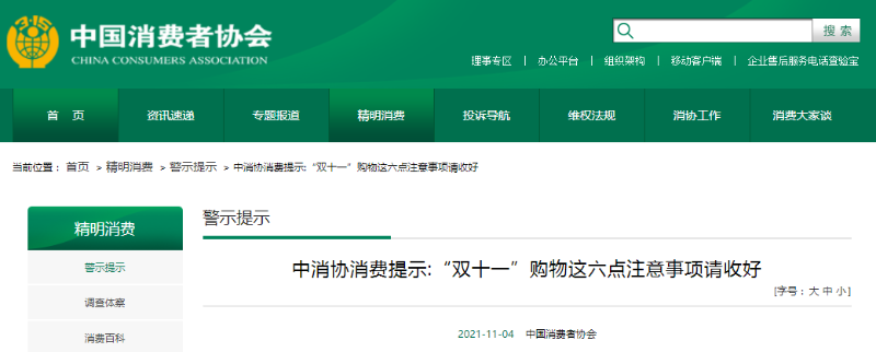 ▲11月4日,中國(guó)消費(fèi)者協(xié)會(huì)發(fā)布“雙十一”消費(fèi)提示。圖/中國(guó)消費(fèi)者協(xié)會(huì)網(wǎng)站截圖
