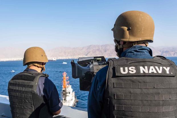 美國海軍“波特蘭”號(hào)船塢運(yùn)輸艦的艦員執(zhí)行警戒任務(wù)