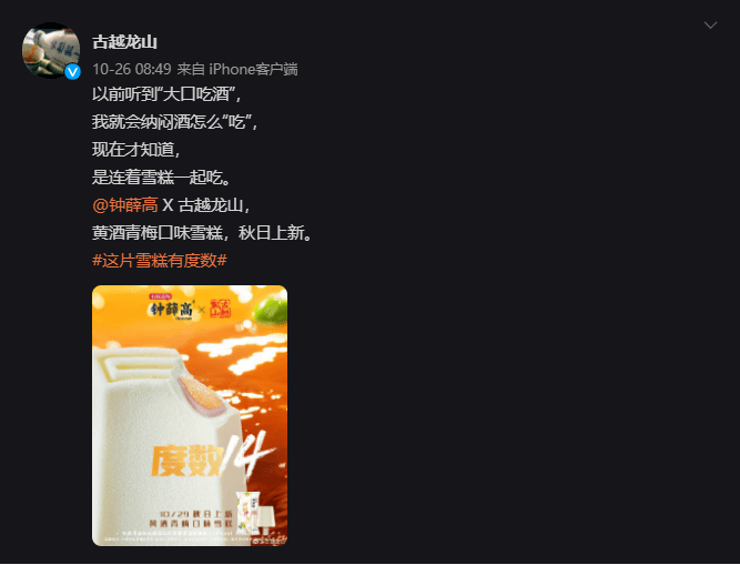 同時(shí),“國(guó)貨崛起”的風(fēng)潮也席卷了各個(gè)行業(yè)。在酒飲領(lǐng)域,國(guó)潮品牌與其它各類(lèi)品牌也在角力之中。10月下旬,百威中國(guó)便上市了兩大低度酒飲品牌,似乎在與此對(duì)抗,國(guó)貨品牌也在發(fā)力搶占市場(chǎng)。古越龍山作為國(guó)內(nèi)老牌的黃酒品牌,近日聯(lián)手知名國(guó)貨冰品品牌鐘薛高,誕生了黃酒青梅雪糕。在這條競(jìng)爭(zhēng)激烈的新酒飲賽道上,近幾年表現(xiàn)亮眼的國(guó)貨品牌依然可圈可點(diǎn),演繹著從內(nèi)容到形式上不倦的產(chǎn)品創(chuàng)新。