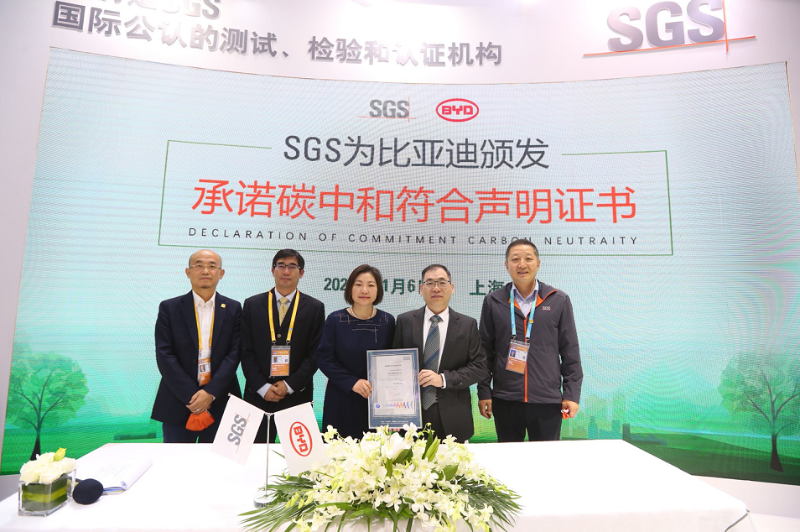 2021年11月6日,第四屆中國國際進(jìn)口博覽會期間,比亞迪獲頒國內(nèi)首張SGS承諾碳中和符合聲明證書。比亞迪集團(tuán)品質(zhì)處總經(jīng)理趙儉平、比亞迪集團(tuán)地區(qū)總經(jīng)理曾銀水、SGS中國區(qū)總裁郝金玉博士、SGS知識與管理服務(wù)事業(yè)群中北區(qū)總監(jiān)郭世同、SGS上海總經(jīng)理牟奇志等出席了頒證儀式。