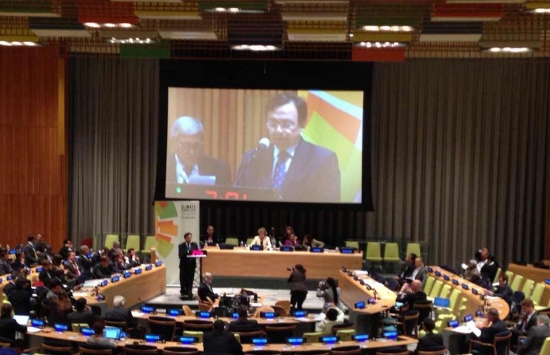 當(dāng)?shù)貢r(shí)間2014年9月23日,巴黎氣候變化大會前最為重要的大會——2014年聯(lián)合國氣候峰會在紐約聯(lián)合國總部隆重舉行,來自全球120多個(gè)國家的元首和政府首腦齊聚一堂,共同商討全球氣候變化問題。應(yīng)時(shí)任聯(lián)合國秘書長潘基文邀請,比亞迪股份有限公司董事長兼總裁王傳福作為全球唯一被邀請的汽車企業(yè)代表,出席峰會并發(fā)表演講。王傳福指出,城市公交電動化是快速提升城市空氣質(zhì)量的最佳途徑,全球?qū)⒂瓉沓鞘泄浑妱踊慕煌ǜ锩?,王傳福呼吁各國將電動汽車引入到更廣泛的城市交通領(lǐng)域,并預(yù)測:不久的將來,光伏發(fā)電及新能源汽車將會成為世界各國的重中之重。