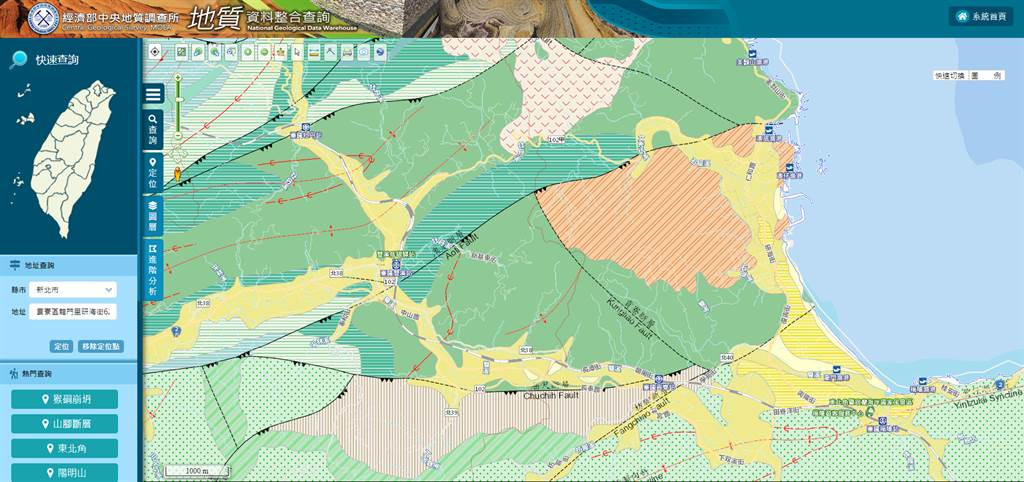 圖為地質(zhì)調(diào)查所“地質(zhì)資料整合”,顯示核四廠周遭有澳底斷層、貢寮斷層、屈尺斷層與枋腳斷層。(圖/摘自地質(zhì)資料整合查詢網(wǎng)站)