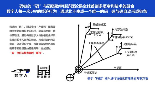 隨著信息技術(shù)的演進(jìn),徐蔚博士基于北斗坐標(biāo)系統(tǒng)、5G通信等技術(shù),創(chuàng)建了“唯一的、可識別、可定位、可跟蹤”的物格數(shù)字空間,創(chuàng)造性的將“碼”擴(kuò)展延伸至“物格”空間,實(shí)現(xiàn)了從碼鏈“數(shù)字人”、碼鏈“數(shù)字物”到碼鏈“數(shù)字地球”的碼鏈體系結(jié)構(gòu)的演進(jìn),將“掃一掃”升級到可穿戴智能終端御空眼鏡“看一看”,構(gòu)建了一個人與人、人與物、人與場(地)隨時隨地鏈接的泛在網(wǎng)絡(luò),基于對物理世界人、物、場的數(shù)據(jù)采集、處理、儲存、傳遞,構(gòu)建一個與物理空間泛在連接、相互映射、實(shí)時聯(lián)動、精準(zhǔn)反饋、系統(tǒng)自治,真實(shí)反映人類社會行為的平行數(shù)字世界。至此,徐蔚博士基于北斗+5G構(gòu)造了碼鏈新型數(shù)字基礎(chǔ)設(shè)施,為人類社會提供一個面向角色、面向場景、響應(yīng)需求的碼鏈數(shù)字化解決方案。
