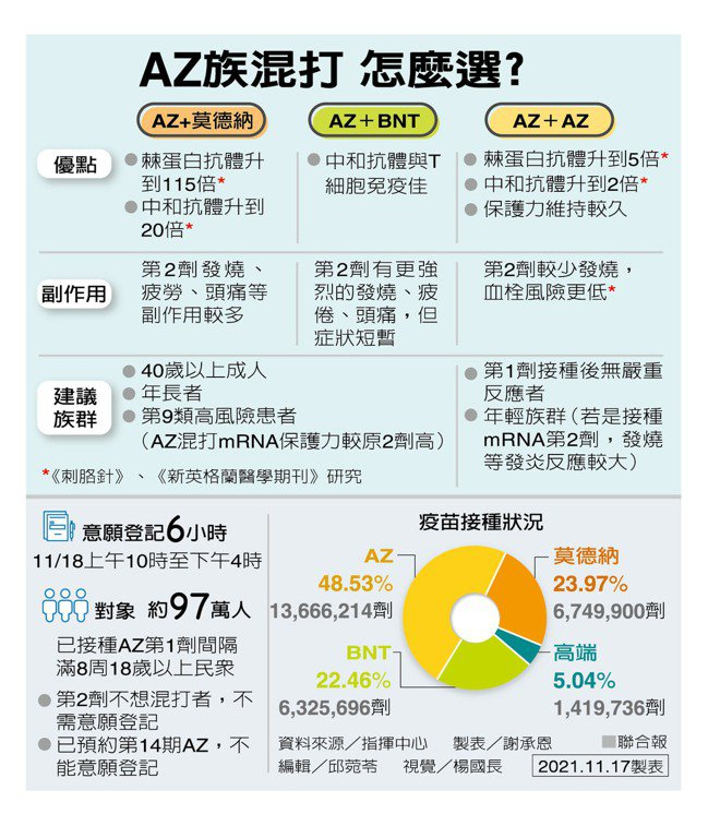 現(xiàn)行規(guī)定,無(wú)論接種第二劑AZ、莫德納及BNT疫苗須滿十八歲以上,其中AZ疫苗須間隔滿八周后接種,莫德納及BNT疫苗則須滿四周;接種高端疫苗須滿廿歲,且必須滿廿八天接種二劑,混打者則務(wù)必間隔滿八周接種。