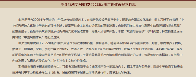 ▲中央戲劇學(xué)院擬招收2022級相聲創(chuàng)作表演本科班。圖/中戲官網(wǎng)截圖