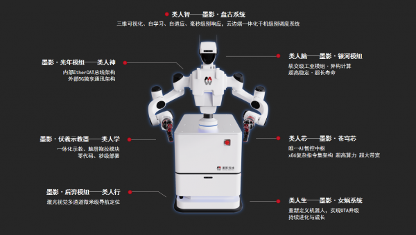 墨影的蒼穹芯,通過選用x86復(fù)雜指令集架構(gòu)芯片,從本質(zhì)上解決了復(fù)雜數(shù)據(jù)邏輯控制與算力及存取帶寬的根本問題;墨影的銀河模組,通過軌交級的工業(yè)模組實現(xiàn)最高30多軸的并行異構(gòu)計算,并且遠超同行,實現(xiàn)超高穩(wěn)定性與超長壽命;墨影的光年模組,機器人對內(nèi)通過EtherCAT總線架構(gòu)實現(xiàn)“飛速傳輸”,對外采用獨享5G通訊架構(gòu),保障超低延時,超大帶寬;墨影的后羿模組,通過激光、視覺多通道實現(xiàn)微米級導(dǎo)航與定位;墨影的伏羲示教器,革命性地實現(xiàn)了一體化示教,通過拖拉模塊,零代碼實現(xiàn)秒級部署,顛覆式地將部署成本進行指數(shù)級壓縮;墨影的盤古系統(tǒng),通過三維可視化呈現(xiàn)、自適應(yīng)、自學(xué)習(xí),云邊端一體化實現(xiàn)千機級別統(tǒng)一調(diào)度;墨影的女媧系統(tǒng),通過OTA升級,實現(xiàn)機器人本體不斷進化與生長,重新定義了機器人行業(yè)的新高度,軟件包加購與升級模式,同時也顛覆了傳統(tǒng)機器人行業(yè)“一生一次”的生意模式,重新建立“一生一世”的商業(yè)模式。