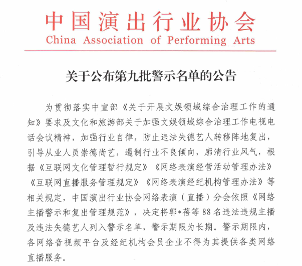 中國演出行業(yè)協(xié)會(huì)網(wǎng)絡(luò)表演(直播)分會(huì)23日發(fā)布第九批網(wǎng)絡(luò)主播警示名單,包括“鐵山靠”“郭老師”兩名職業(yè)主播和“吳亦凡”“鄭爽”“張哲瀚”三名演員在內(nèi)的88名主播將在行業(yè)內(nèi)被實(shí)行聯(lián)合抵制和懲戒。這是違法失德藝人首次被納入網(wǎng)絡(luò)主播警示名單中,防止劣跡藝人轉(zhuǎn)移陣地復(fù)出。名單向社會(huì)公布后將下發(fā)各平臺予以封禁,并同步報(bào)主管部門備案。